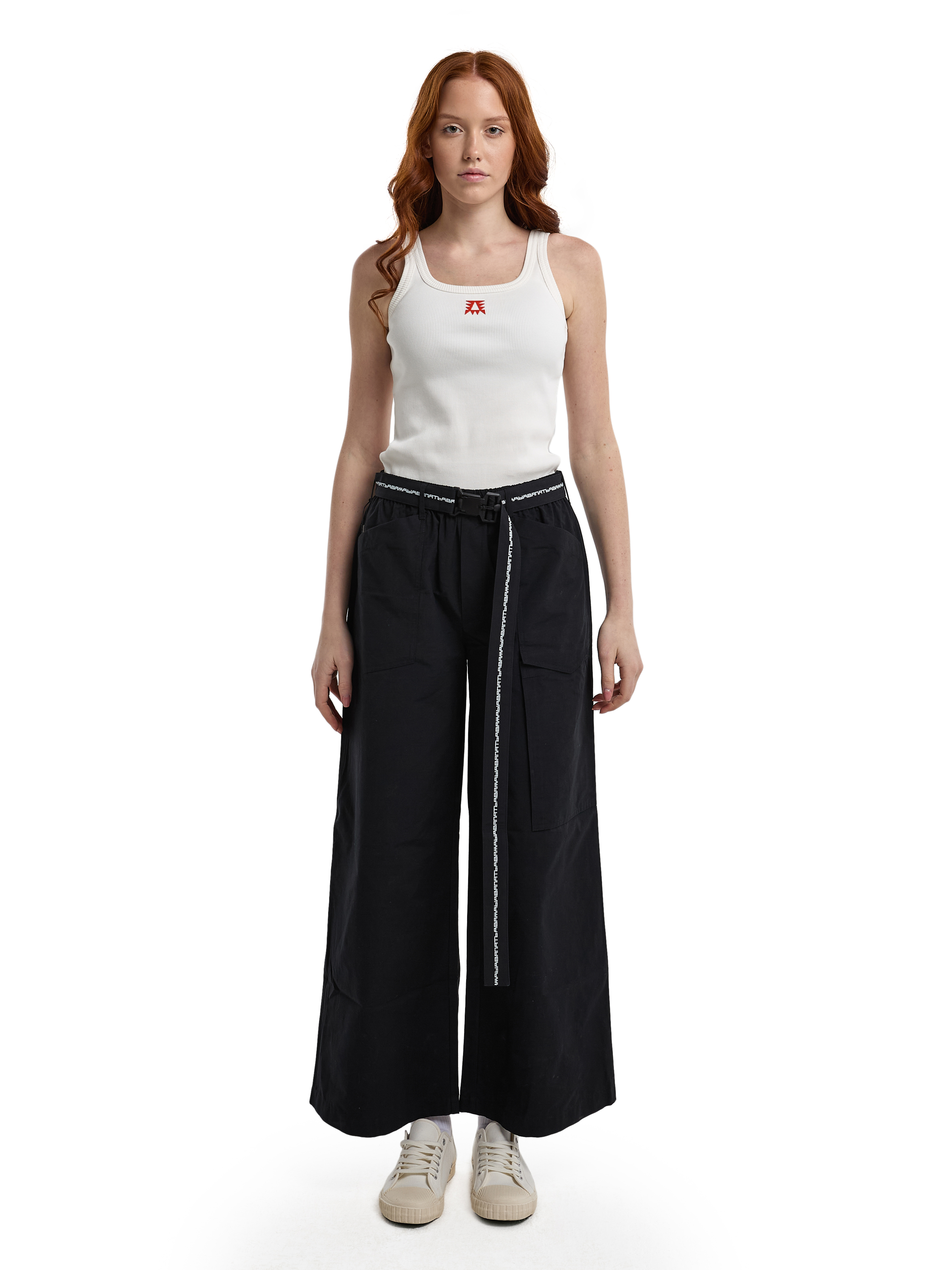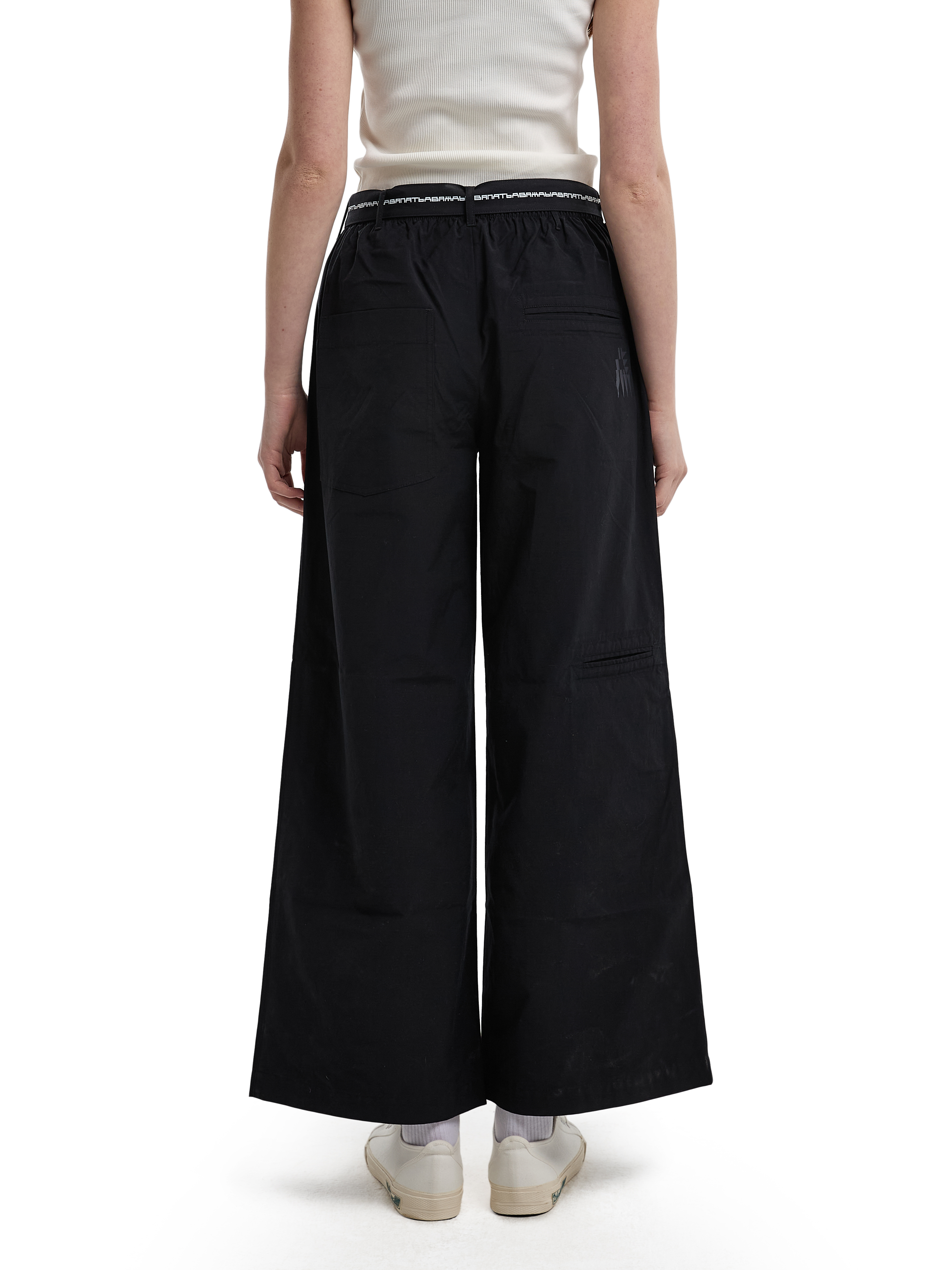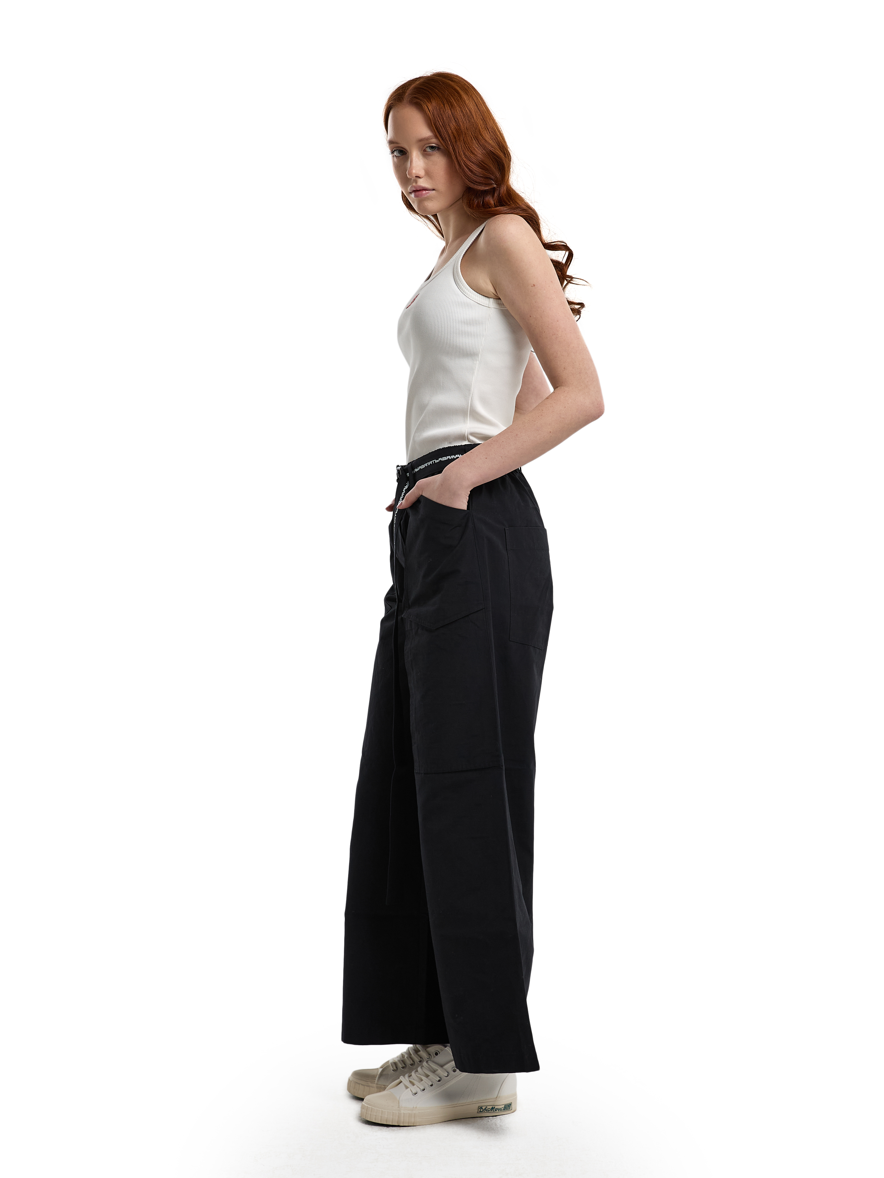 Широкие брюки на эластичном поясе-резинке со шлевками и тремя накладными карманами спереди и двумя прорезными сзади в рамку. Модель декорирована печатью в технике "шелкография". Мидлфит. Черные. 65% нейлон, 35% хлопок, 95-150 грамм.
