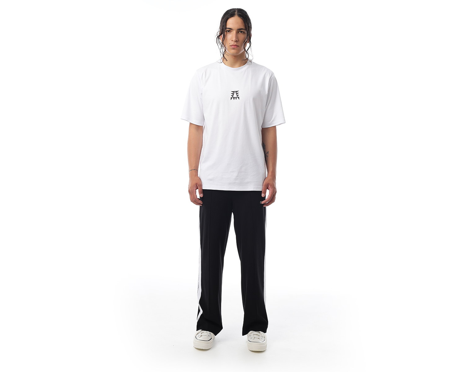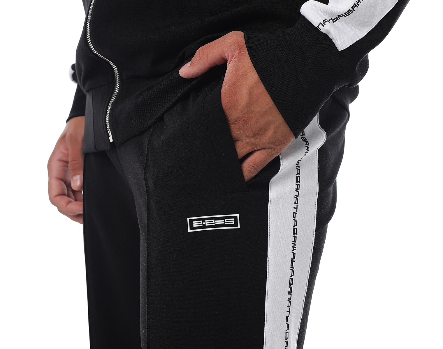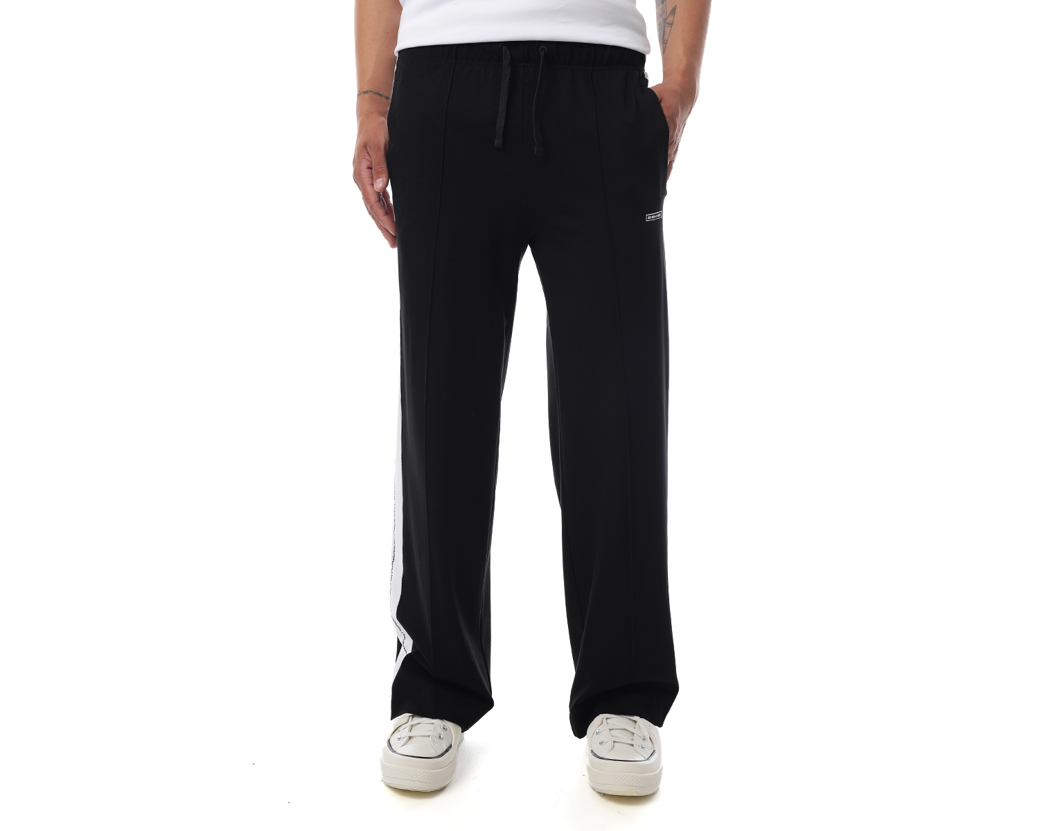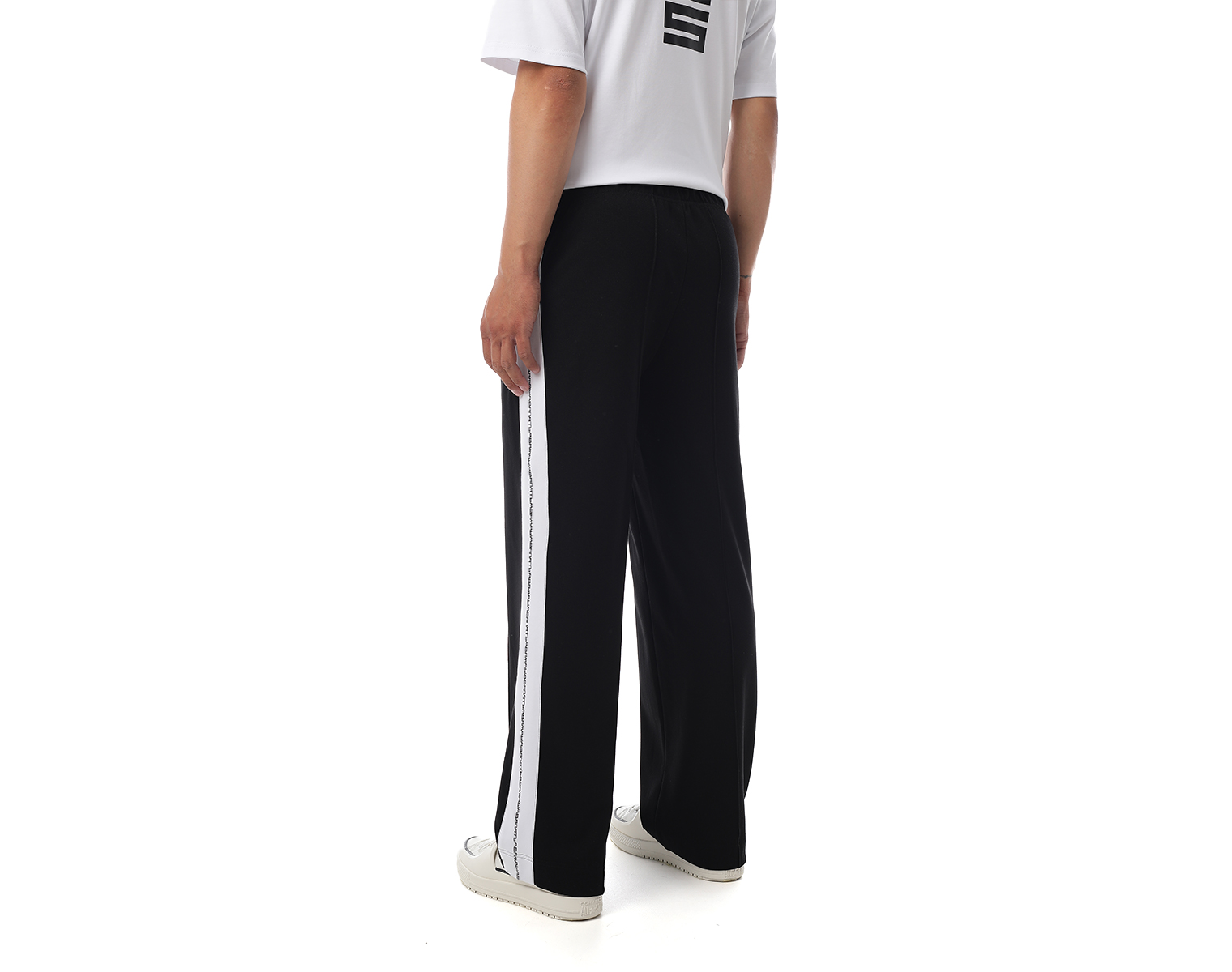 Трикотажные брюки с принтованными лампасами, боковыми карманами и отстроченными стрелками. Черный. Мидлфит. Черный. Состав материала: 50% модал, 45% полиэстер, 5% эластан, 250 грамм.