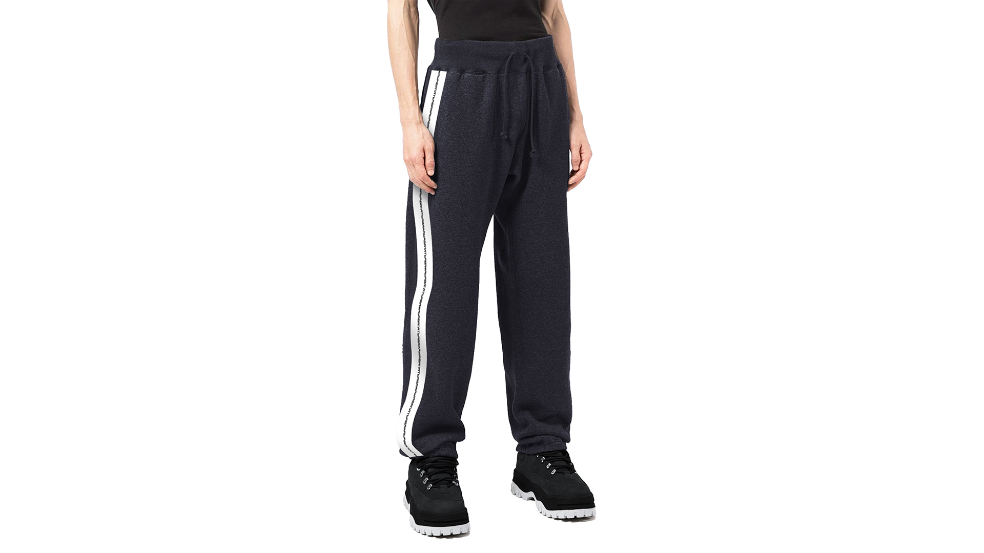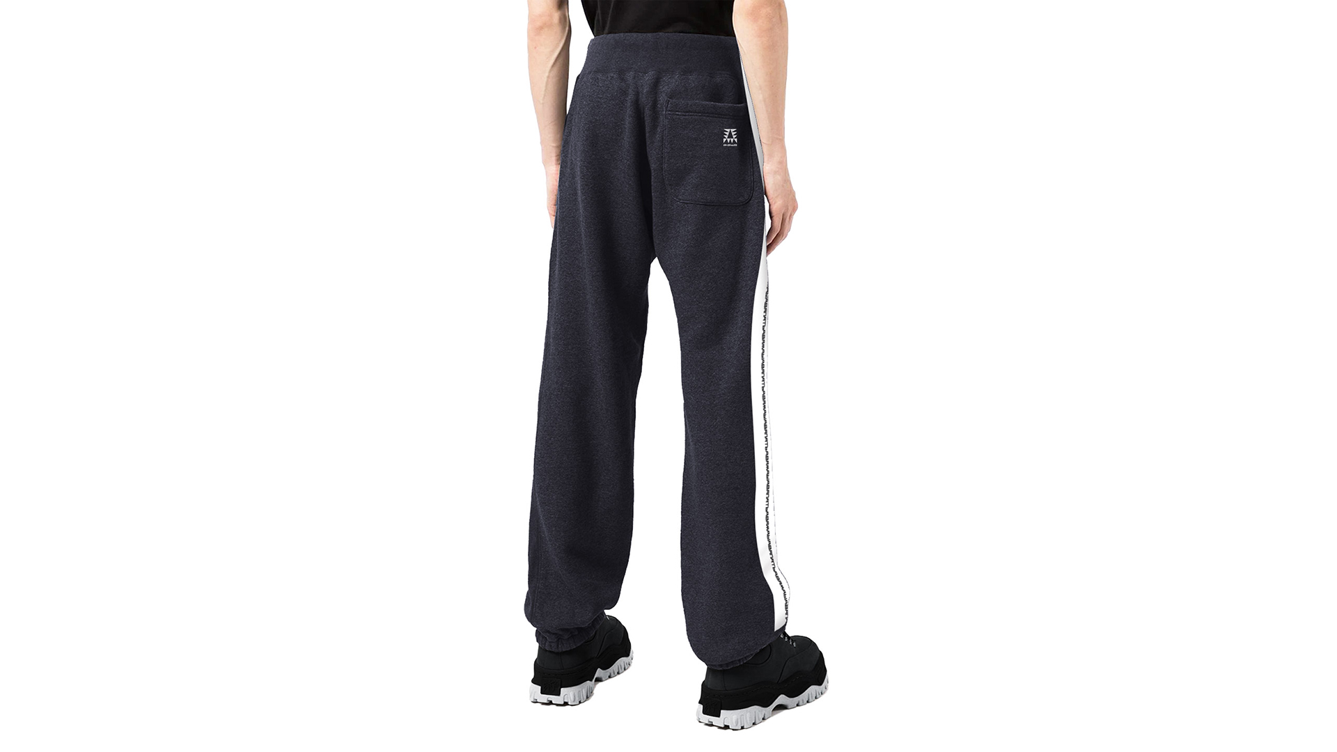 Трикотажные брюки на эластичном поясе-резинке с кулисой и накладным карманом сзади. Брюки артикулированы брендированными вязаными лампасами. Графит. Мидлфит. Состав материала: 50% модал, 45% полиэстер, 5% эластан, 250 грамм.