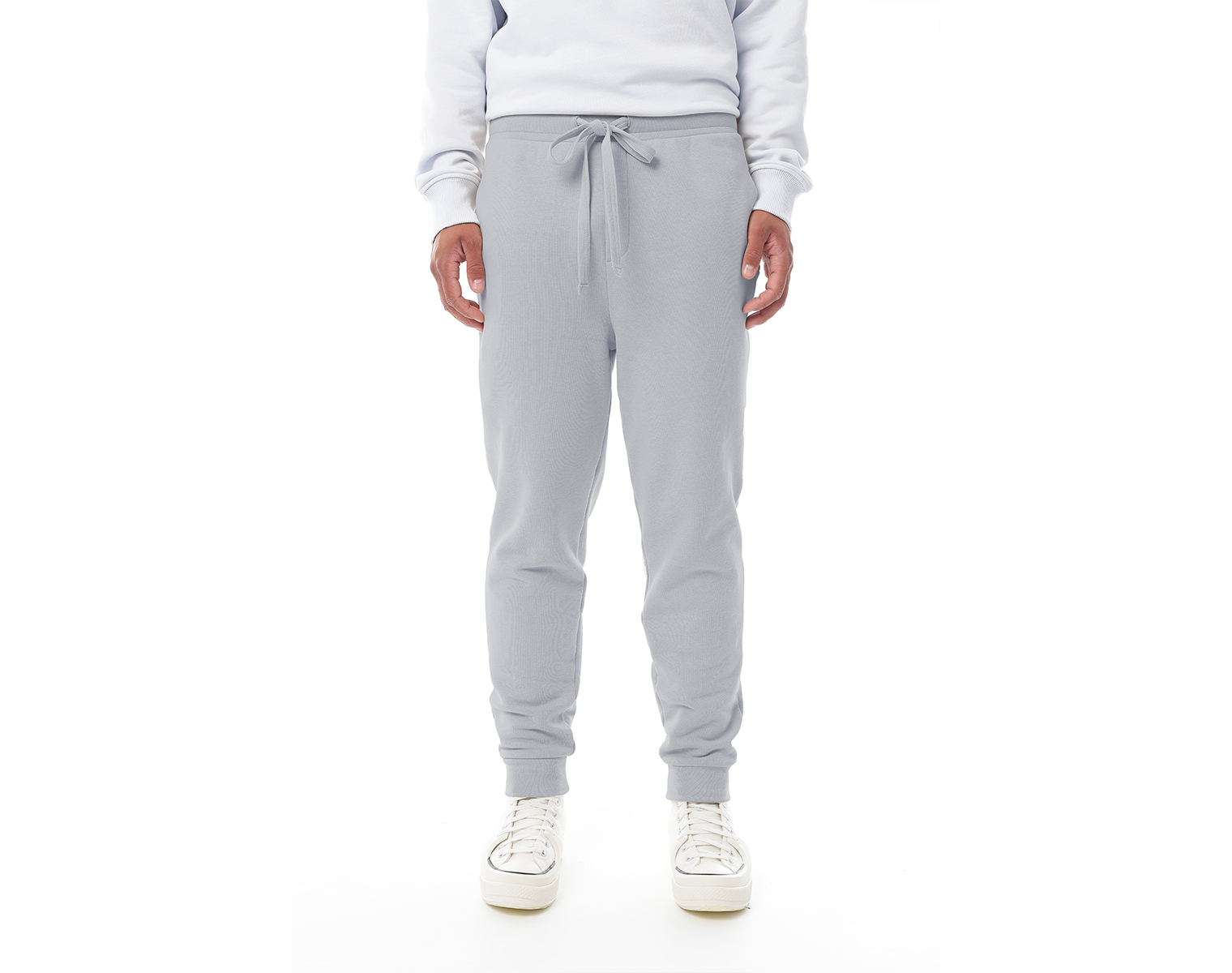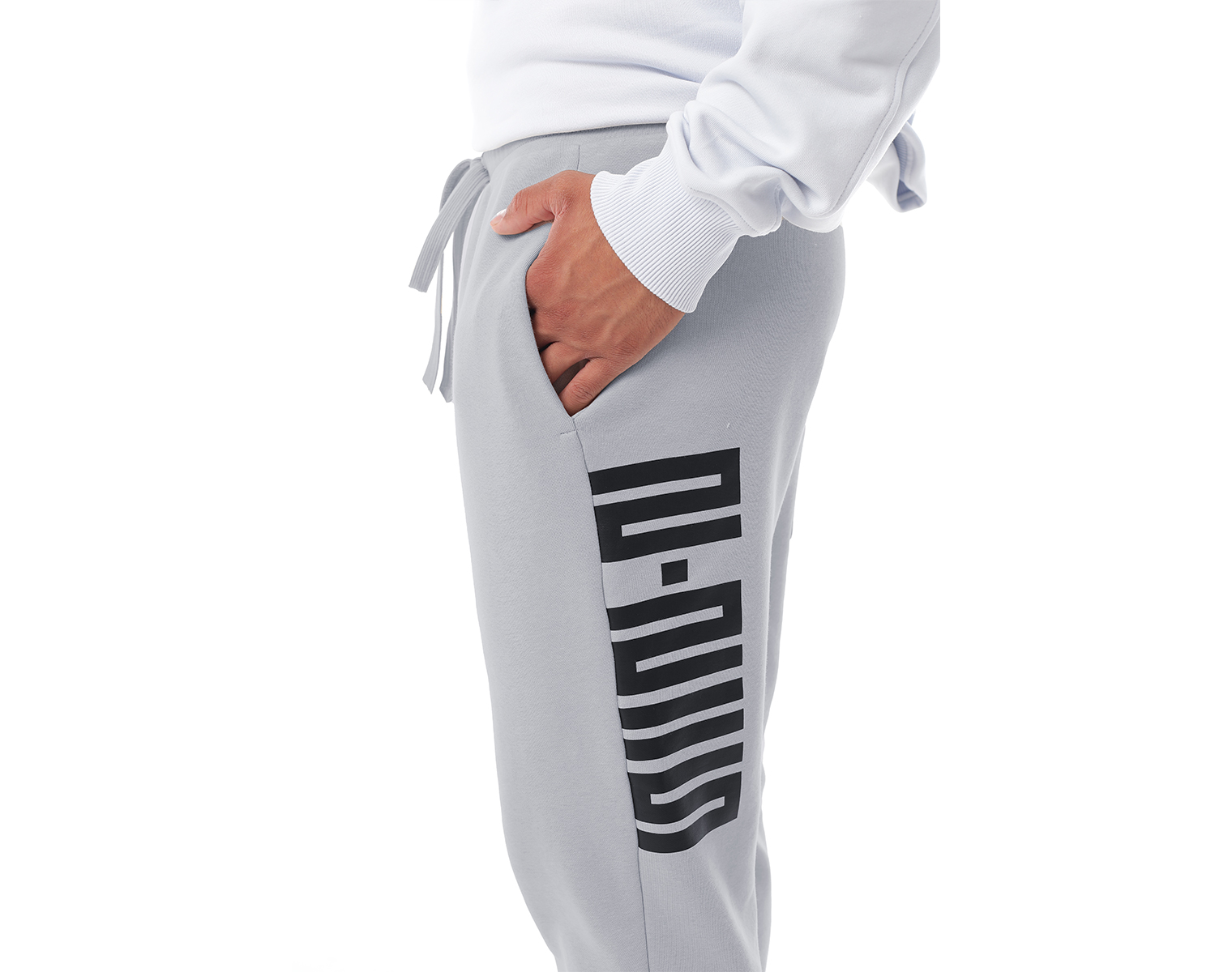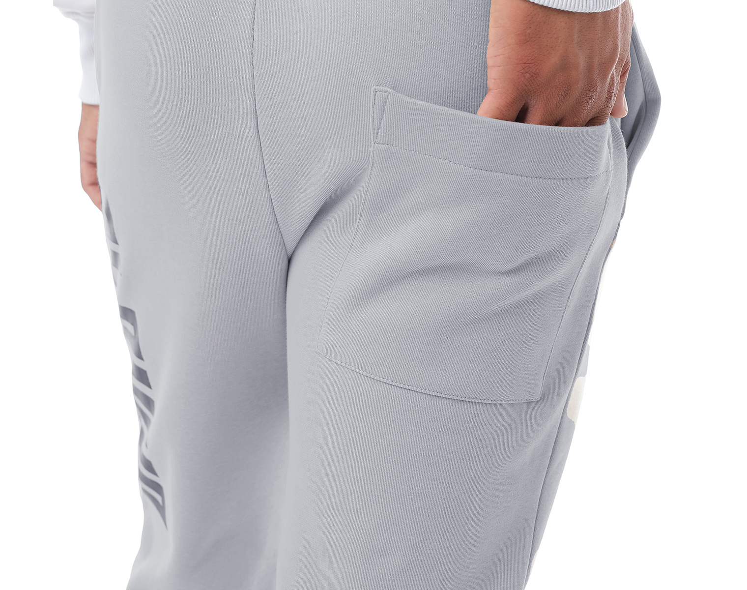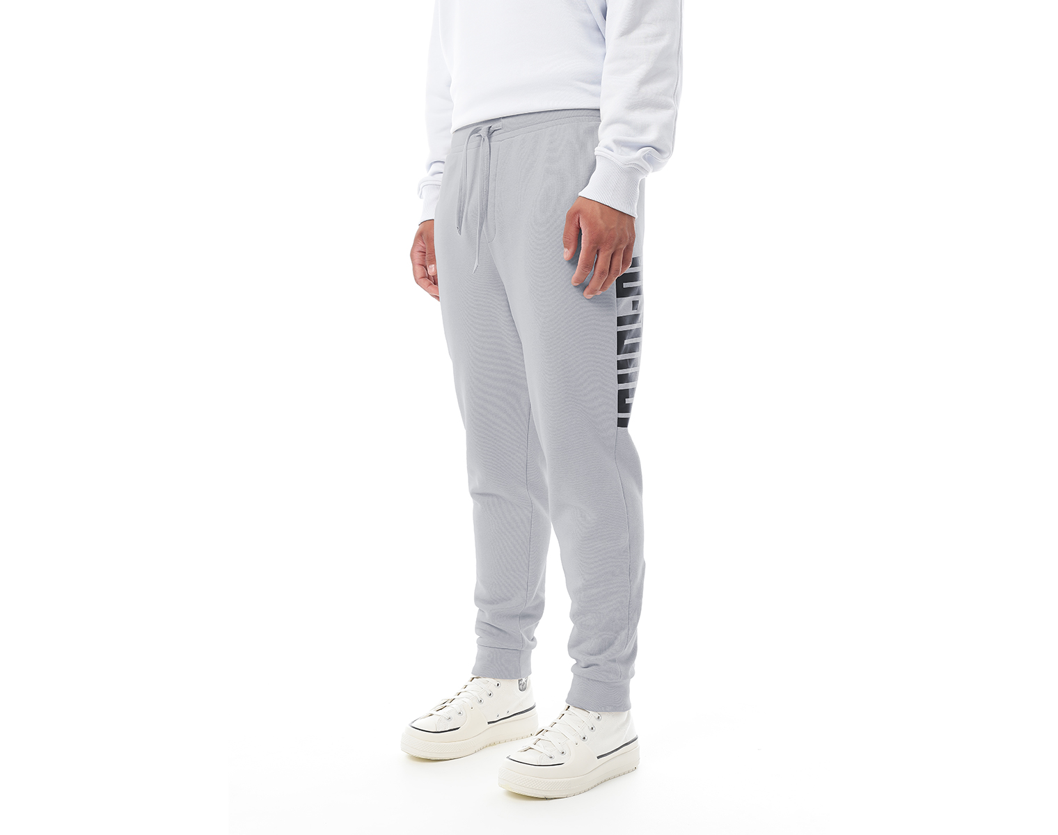 Трикотажные брюки-джоггеры на эластичном поясе-резинке и накладным карманом сзади. Серый меланж. Модель декорирована печатью в технике DTF. Мидлфит. 100% хлопок, 380 грамм.