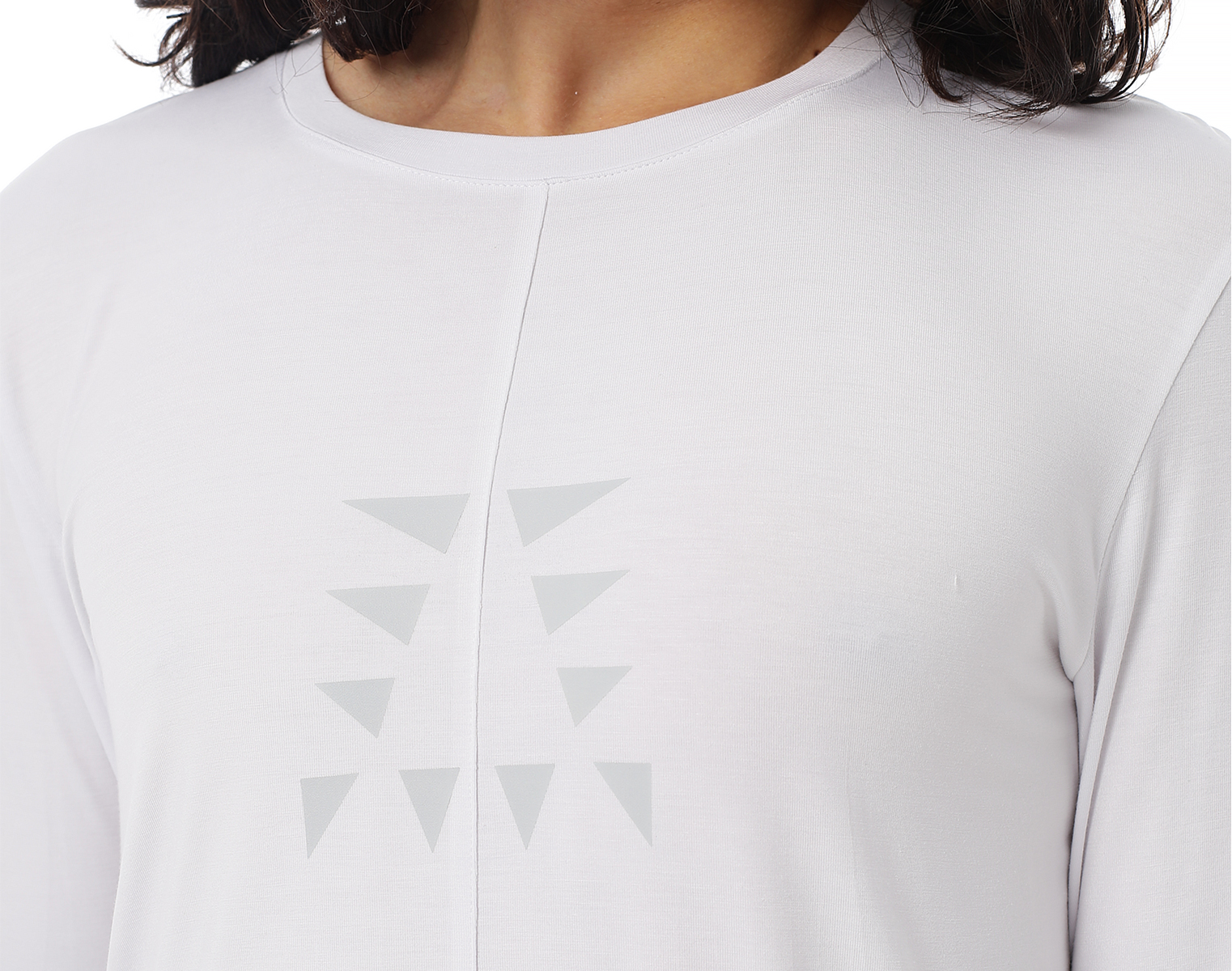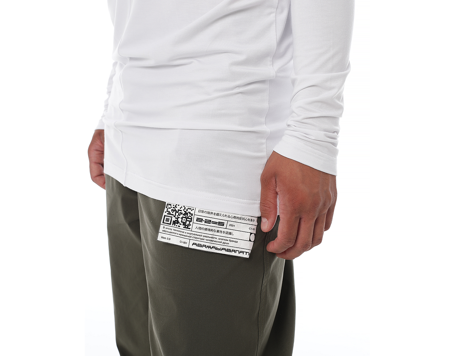 Лонгслив. Пепельно-белого цвета. Слим. 100% хлопок, плотность 180 грамм. Модель декорирована печатью в технике DTF и этикеткой-ярлыком по низу полочки.