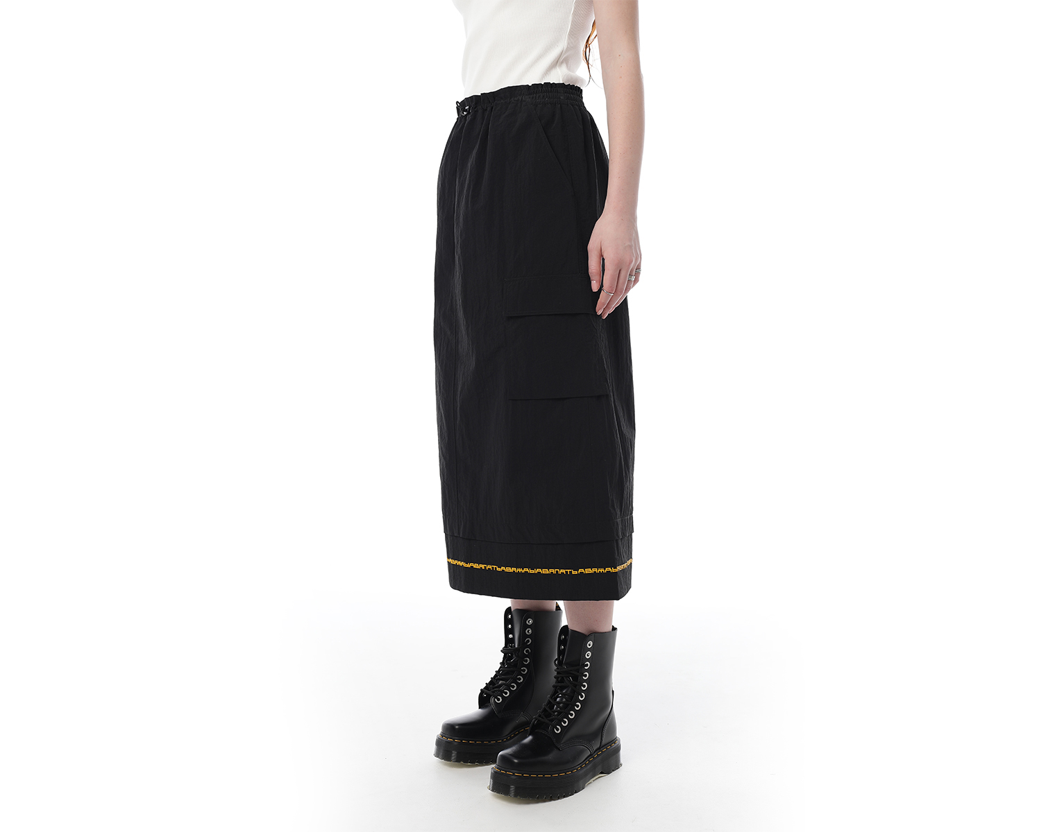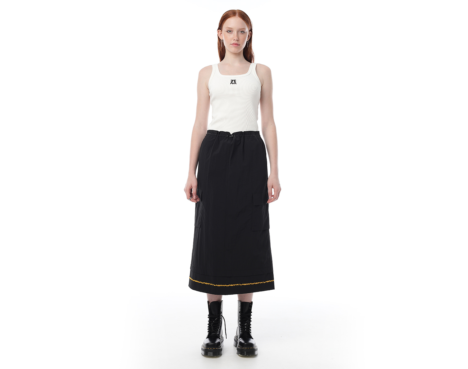 Юбка макси с регулируемым резинкой-поясом на талии, с парными боковыми и накладными карманами, шлицей сзади и контрастным объемным принтом по низу изделия в технике высоко-рельефной печати flextran. Мидлфит. Соств: 60% полиамид, 40% полиэстер, 95-150 грамм.